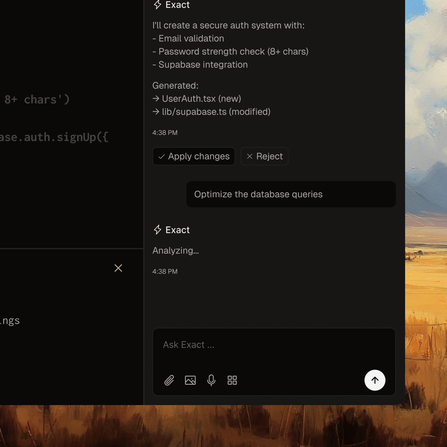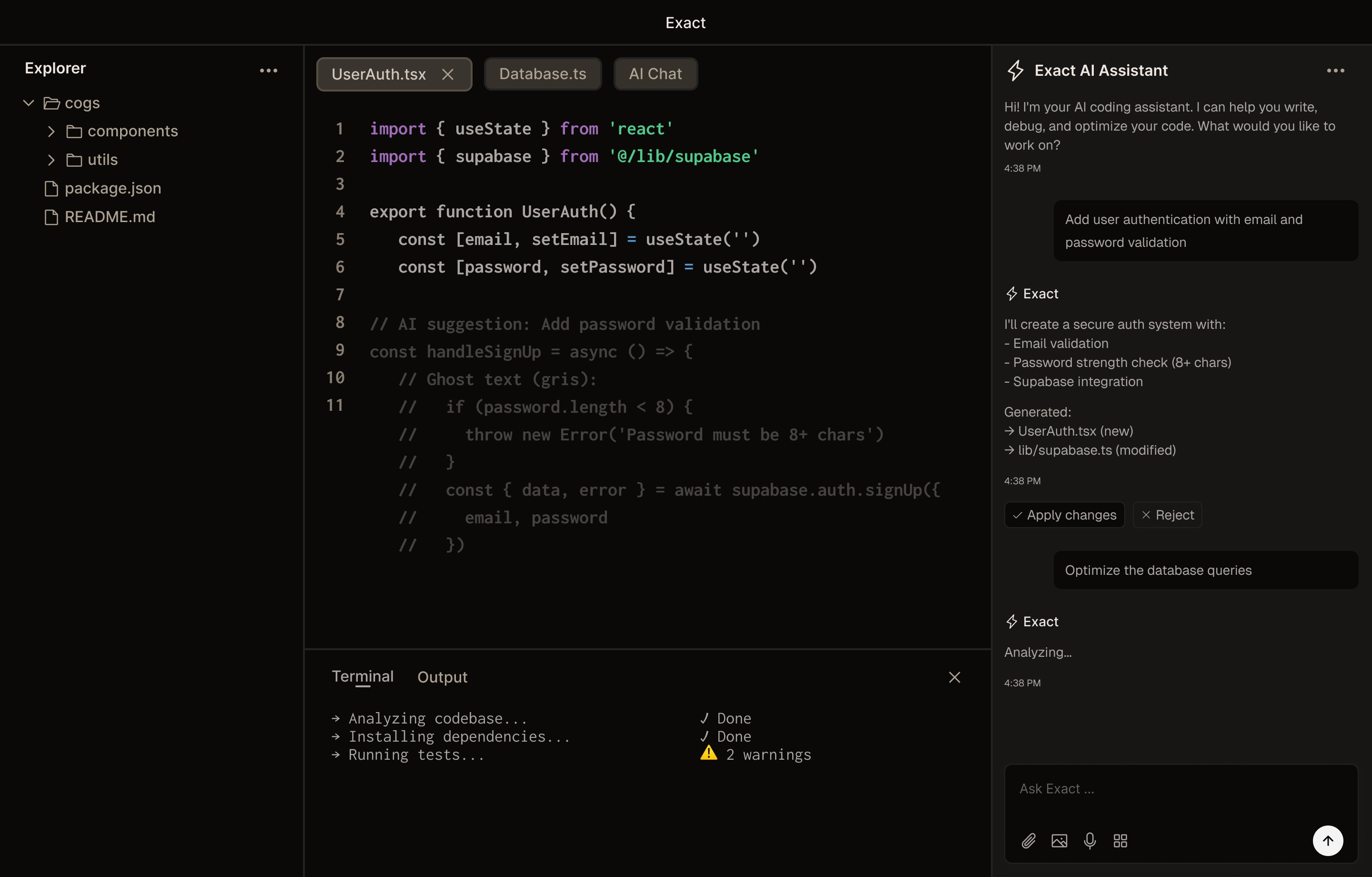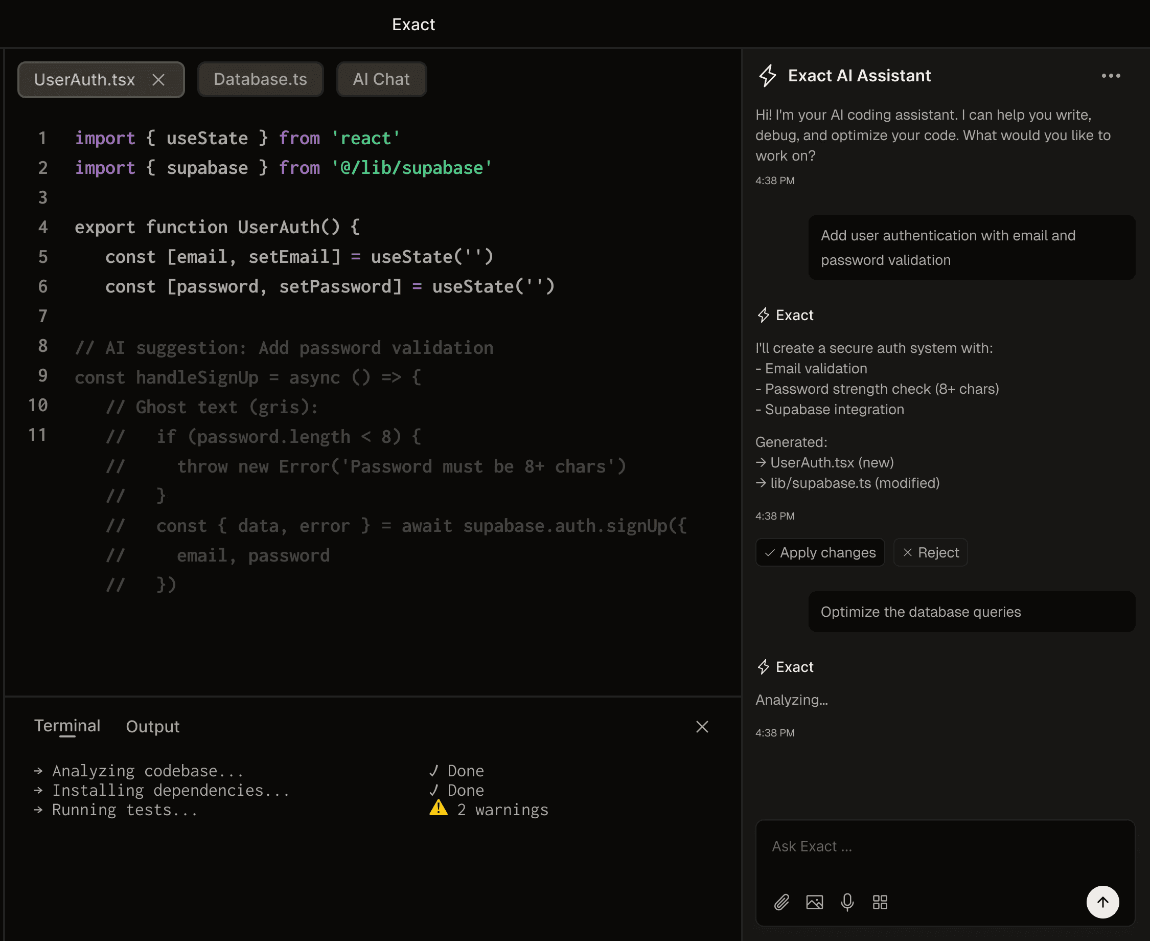 Build frontend and backend seamlessly. Exact understands your entire stack—from React components to database queries—and helps you ship faster with context-aware suggestions.