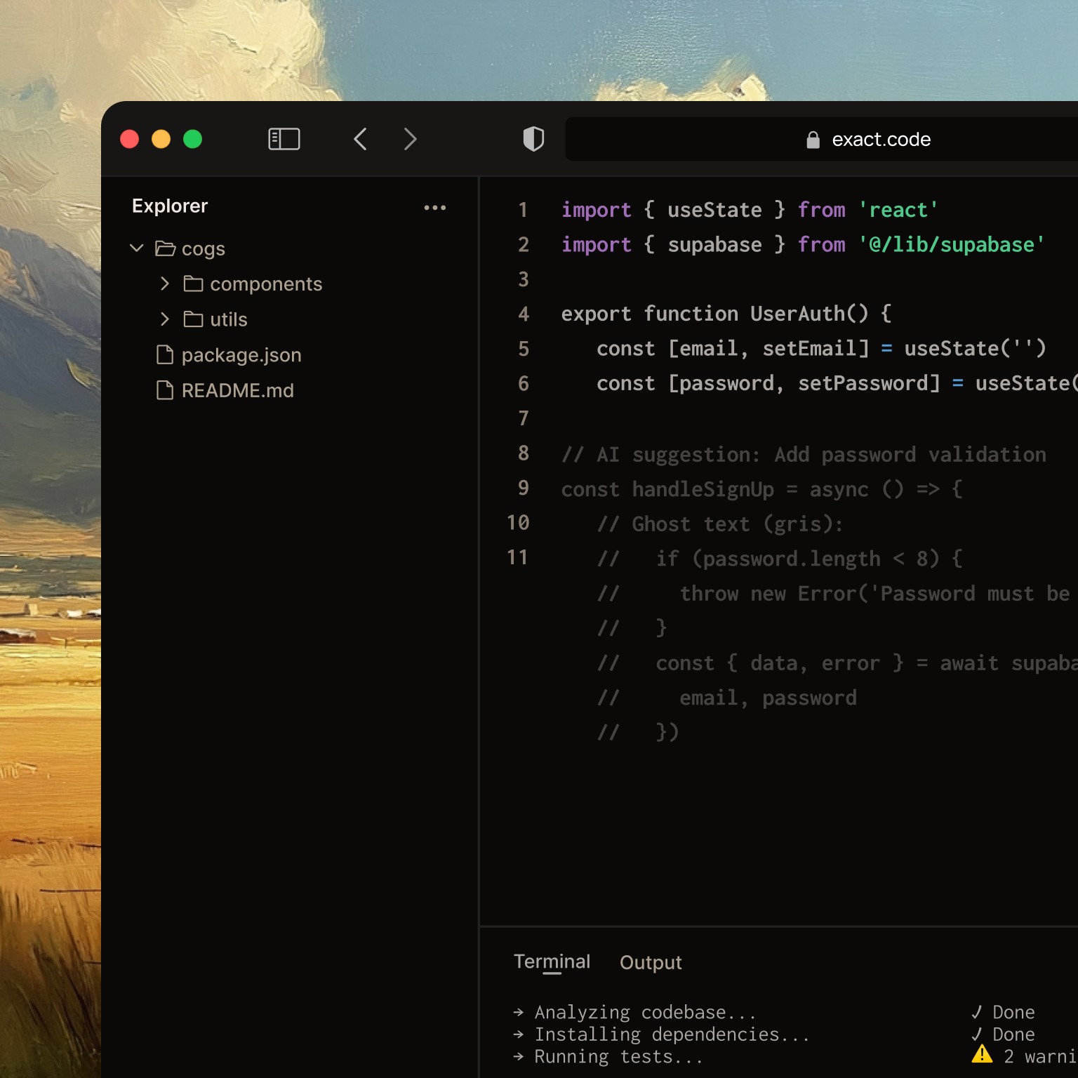 Debug smarter with instant error detection, suggested fixes, and command optimization. Let Exact handle the terminal heavy lifting.
